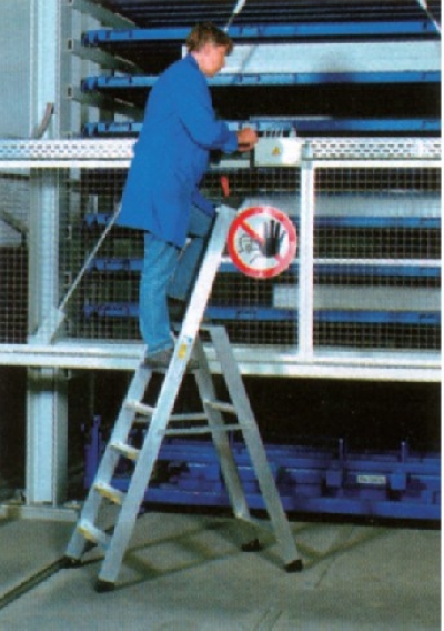 用于要求最大稳定性时。 85 mm 深阶梯,可安全站立。 带有综合铰链连接的宽大安全平台 (380 mm×260 mm) 。 通过两侧的安全连接达到最佳稳定度。 两个综合吊桶勾。 7成阶梯经索式体化处理 – 中部的支撑网用于连接横蹬。 平整且易抓的横蹬外表面。 台阶及横蹬用挤压铝节制作。