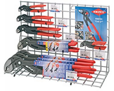 用以展示成套的“鳄鱼嘴”系列产品陈列架,足以吸引使用者的目光 ;可以与展架配合使用 ;也适合摆放在柜台上陈列 ;配备资料架,用以陈列介绍“鳄鱼嘴”系列产品的小册子 ;配有透明标签架 ;一定要注明提供小册子和标签 ;包括“鳄鱼嘴”水泵钳87 01 180/250/300/400/560各3把 ;材料:实心钢丝,银粉镀层