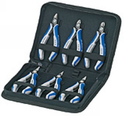 6件工具,包含有6把精密的电子钳;箱子为耐磨聚酯面料,钳子用弹力带固定,带拉链